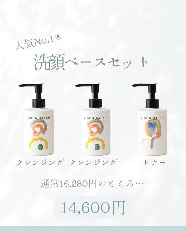 \BASEショップ限定/ 人気No.1のクレンジング! スキンケアの要である洗顔のお得なセット 内容 ✴︎クレンジング(化粧落とし/洗顔)…2本 ✴︎トナー(化粧水)…1本 合計価格通常16,280円のところ【14,600円】‼︎ ーーーーーーーーーーーーーーーーー 福井県福井市、美容室・エステサロン(ORANG ORANG)を経営し21年 代表(堀)自身がアトピーや敏感肌に長年悩み、 肌質改善を叶えるブランドとして 「JIBUN SALON」を2021年に立ち上げました 美容師という視点から肌に優しく、肌が喜ぶものを作りたいという気持ちを込めて 肌質、年齢、性別を問わずどなたでも安心してご使用いただけるよう開発しました 肌悩みを持つすべての人へ