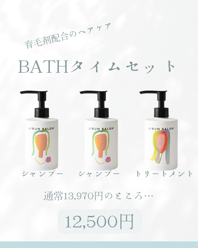 \BASEショップ限定/ JIBUN SALON初のヘアケアシリーズ! 育毛に特化した成分配合により、髪を育むシャンプー&トリートメント 香料不使用で優しい精油での香り付けも喜ばれるポイントです 内容 ✴︎シャンプー…2本 ✴︎トリートメント…1本 合計価格通常13,970円のところ【12,500円】‼︎ ーーーーーーーーーーーーーーーーー 福井県福井市、美容室・エステサロン(ORANG ORANG)を経営し21年 代表(堀)自身がアトピーや敏感肌に長年悩み、 肌質改善を叶えるブランドとして 「JIBUN SALON」を2021年に立ち上げました 美容師という視点から肌に優しく、肌が喜ぶものを作りたいという気持ちを込めて 肌質、年齢、性別を問わずどなたでも安心してご使用いただけるよう開発しました 肌悩みを持つすべての人へ