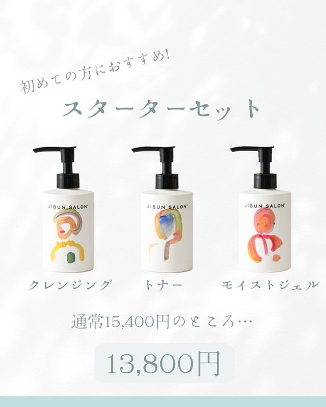 \BASEショップ限定/ JIBUN SALONの基本セットで 初めて使う方におすすめ♡ 内容 ✴︎クレンジング(化粧落とし/洗顔)…1本 ✴︎トナー(化粧水)…1本 ✴︎モイストジェル(美容液保湿ジェル)…1本 合計価格通常15,400円のところ【13,800円】‼︎ ーーーーーーーーーーーーーーーーー 福井県福井市、美容室・エステサロン(ORANG ORANG)を経営し21年 代表(堀)自身がアトピーや敏感肌に長年悩み、 肌質改善を叶えるブランドとして 「JIBUN SALON」を2021年に立ち上げました 美容師という視点から肌に優しく、肌が喜ぶものを作りたいという気持ちを込めて 肌質、年齢、性別を問わずどなたでも安心してご使用いただけるよう開発しました 肌悩みを持つすべての人へ